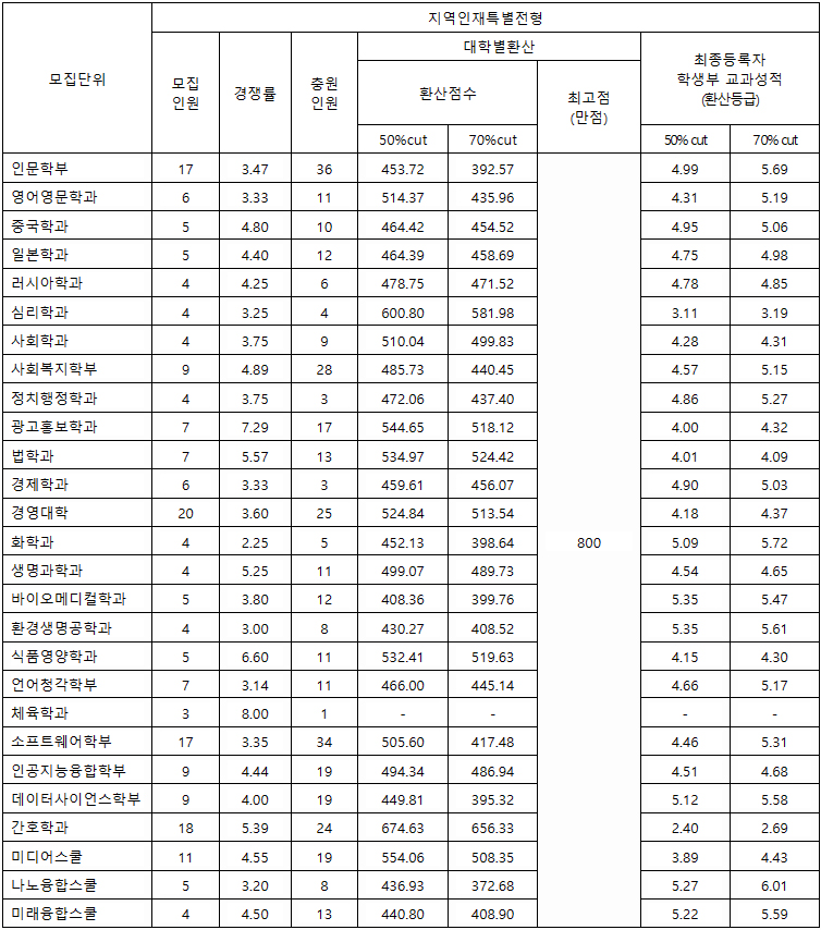 다음으로는 한림대학교 수시 학생부교과 지역인재특별전형의 결과를 살펴보겠습니다.
