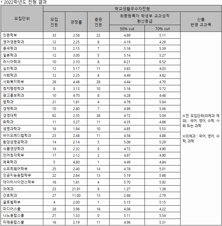 학교생활우수자전형에서 가장 높은 경쟁률을 기록한 학과는 21.91대 1을 기록한 의예과였으며, 그다음은 11대 1을 기록한 간호학과, 5.17대 1을 기록한 심리학과 등의 순서를 기록하였습니다.