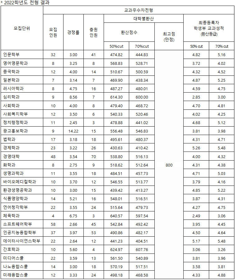 수시 교과우수자전형에서 가장 높은 경쟁률을 기록한 학과는 14.22대 1을 기록한 광고홍보학과였으며, 그다음은 8.56대 1을 기록한 심리학과, 6.75대 1을 기록한 체육학과 등의 순서를 기록하였습니다.