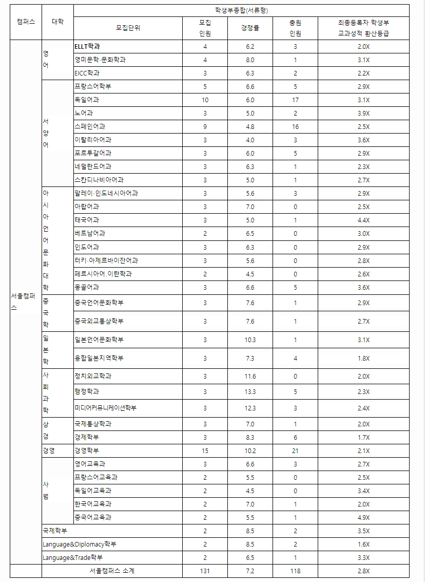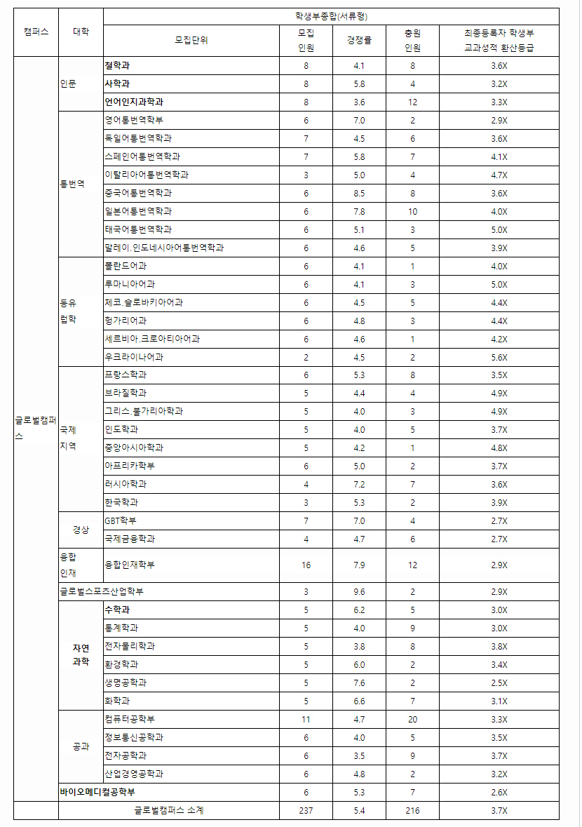 다음은 한국외국어대학교 수시 학생부교과전형의 결과입니다.
