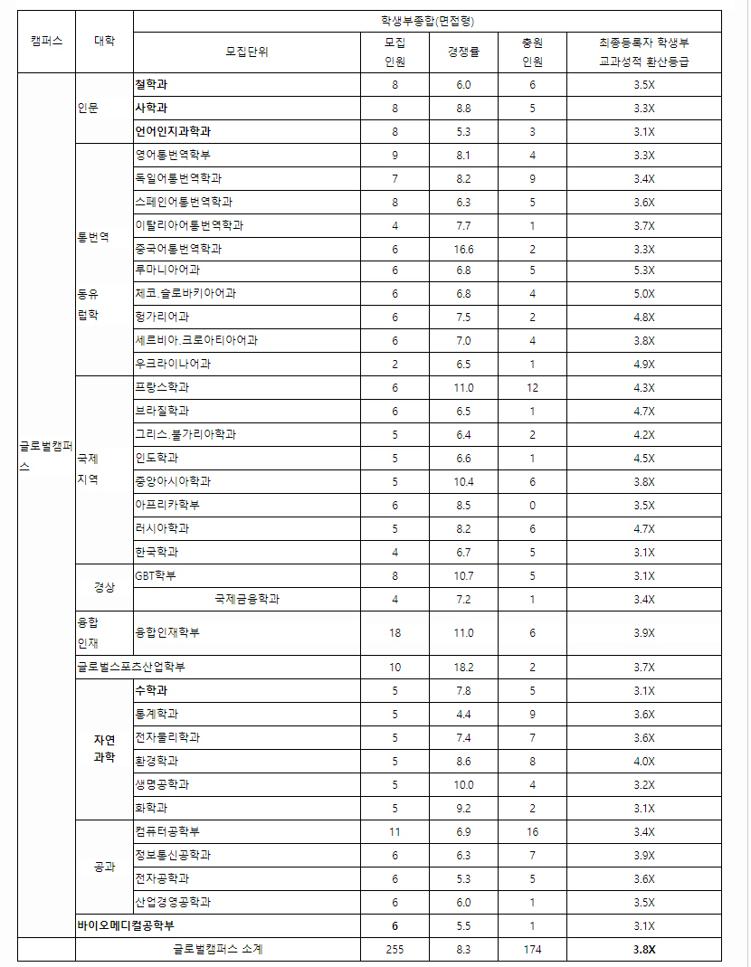 나머지 일반학과의 결과와 글로벌캠퍼스의 결과는 아래 표를 참고하여 주시기 바랍니다.