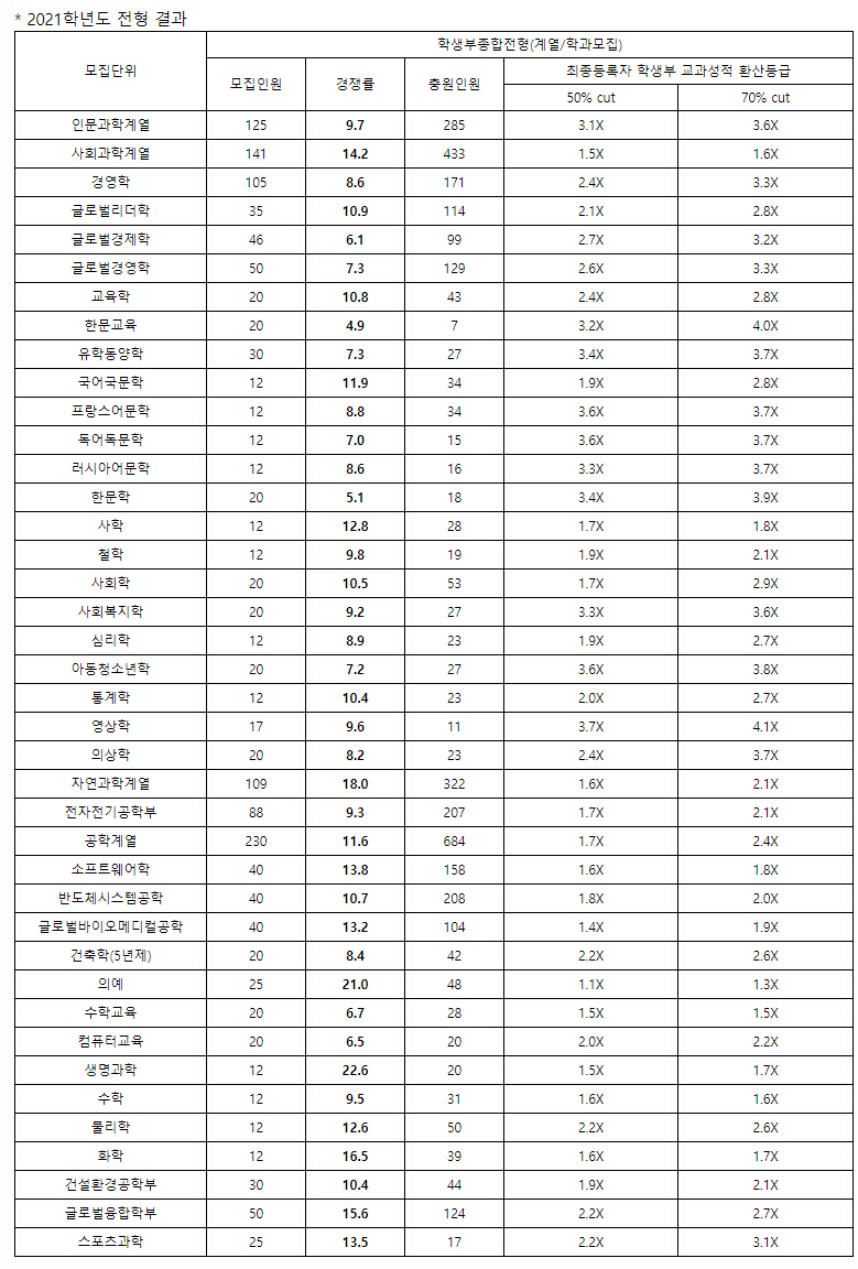 | 2021 연세대 수시등급 컷 및 경쟁률 분석 - 연세대학교 수시결과 (0) | 2021.11.24 |