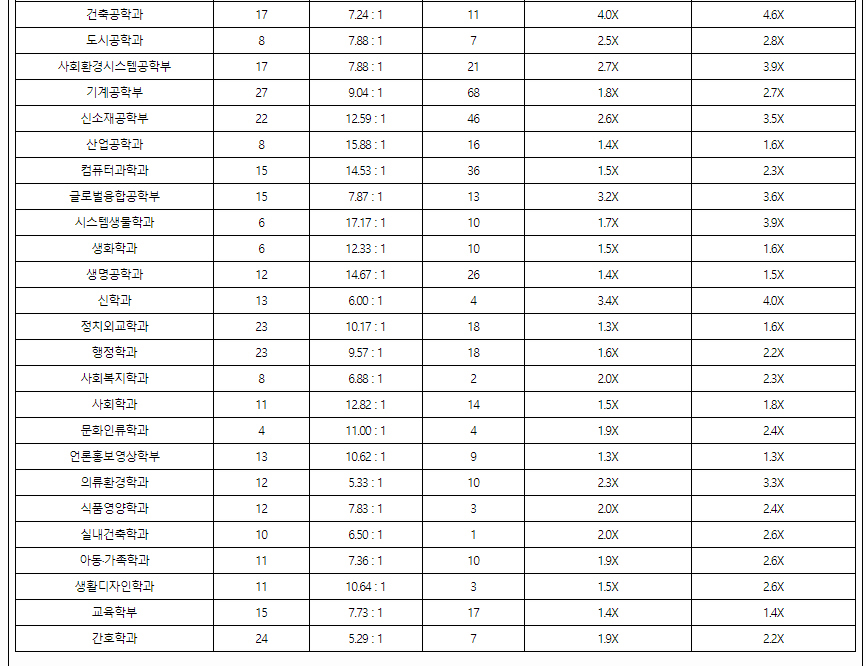 가장 낮은 경쟁률을 기록한 학과는 4.33대1을 기록한 사회환경시스템공학부였으며, 그 다음은 4.67대1을 기록한 건축공학과였습니다.
