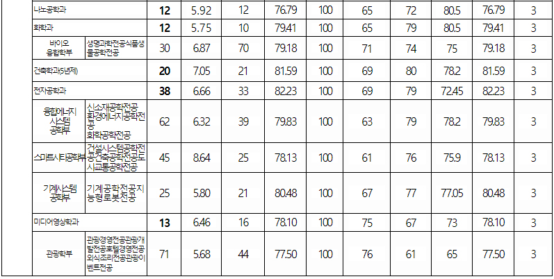 반면, 정시 다군에서 가장 낮은 경쟁률을 기록한 학과는 5.55대 1을 기록한 경제학부였으며, 그 다음은 5.68대 1을 기록한 관광학부, 5.75대 1을 기록한 화학과 등의 순이었습니다.